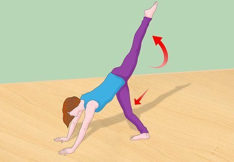 Do Standing Splits against a wall. A good variation of the Standing Splits involves resting your raised leg against a wall, or top on something such as a chair, table or a ballet barre. To perform this variation you can just move from a Standing Forward Fold into Standing Split a suitable distance in front of the object you will rest you raised foot on. Alternatively, you could start from a King Arthur Pose. This involves kneeling with your back to the wall and placing the shin of your left leg behind you and against the wall. Your toes should be touching the wall, and your knee a few inches in front of it. Your right leg should be bent in a kneeling position with your knee in a line above your heel. Bring your hands down to the ground in front of you, and place them shoulder-width apart. Now slowly lift your left knee off the ground, and walk your left foot up the wall behind you. This variation allows you to support your elevated leg against a solid object, which is particularly helpful if you are still building up strength and flexibility. It's a good idea to practice the pose against a wall before you try it without any support.