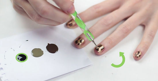 Make small spots with the brown color. Take your dipping tool, such as a toothpick, and dab it into the brown color. Then, use the tool to add small dots of brown polish to your nail. The dots should be fairly wide, forming spots. You want to ensure there is enough space between the dots for the black semi-circles so leave a little room between each dot. Add small brown spots to all of your nails, using more brown color on your palette as necessary. Don’t worry about the dots appearing too perfect and round. They should look like spots, not polkadots.