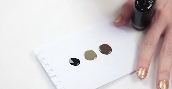 Create the palette of brown and black nail polish. You will need to set up a palette of colors for the cheetah print so they are easy to access. Use the nail polish brush to put a small amount of the brown color on the piece of scrap paper. Then, put a small amount of the black color on the other end of the scrap paper. Make sure the two colors do not mix on the palette. Start with a small amount of each color and then add more nail polish to the palette as you go. This will ensure the nail polish does not start to dry or get clumpy as you create the cheetah print on each nail. If you are using bronze, gold, or another color for the brown part of the cheetah spots, pour out that color on the palette so it is ready to go.