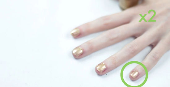 Apply two coats of the base color. Once your nails are clean and trimmed, you should apply two coats of your chosen base color. You may use beige, gold, nude, or a bright color like blue as the base. You may also decide to keep your nails bare, with no base color. If you are using a base color, make sure you brush the color from the cuticle to the top of your nail. Always apply the polish from the middle of your nail to the outer sides. Let your nails dry after the first coat. Then, apply the second coat. Try not to let the nail polish get cakey or thick on your nails, as you want a nice, even base coat.