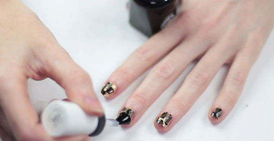 Create semi-circles in black. Once the brown spots have been added to your nails, you will need to add semi-circles in black around the spots. Clean the dipping tool with water and a paper towel or use a new toothpick. Dab your dipping tool into the black polish and draw a small “C” or semi-circle around the edge of the brown dot. You want the semi-circle to be thin and flush to the brown dot. Add semi-circles to all the brown dots on your nails, making sure they appear as small “C”s that are thin and flush to the brown dot. Check that the semi-circles do not touch each other, as you do not want the cheetah spots to blend together. There should be a small amount of space between each semi-circle on your nail.