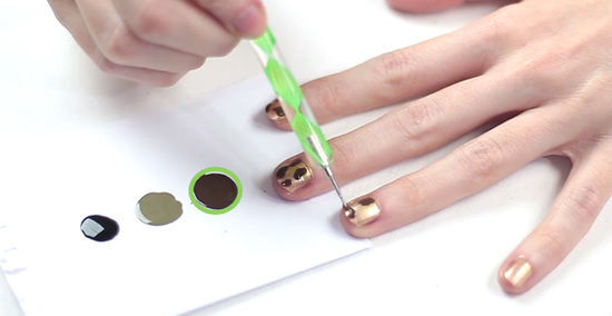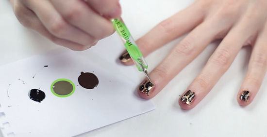 Add smaller dots around the black circles. Now that you have your cheetah spots, you can add smaller dots in the empty spaces around the black circles to fill them. You can use black polish or brown polish to fill in the spaces. Clean off the dipping tool with water and add your chosen color to your palette. Then, use the dipping tool to add smaller dots around the cheetah spots. Do this for all of your nails. Do not worry about the dots appearing perfectly round or the same size. They can be small dabs or dots, as long as they fill up the empty spaces between the spots.