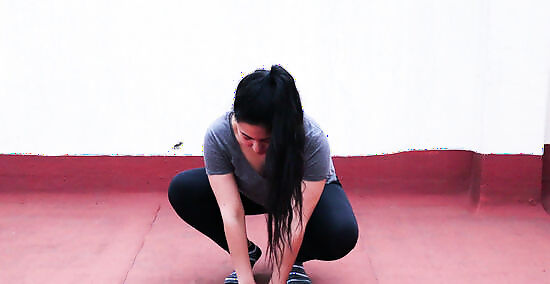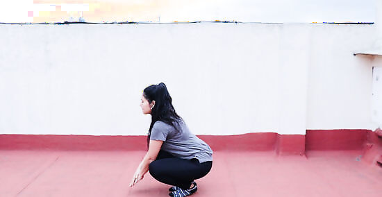 Spread your feet apart and squat down as you exhale. Move your feet on the mat so they are slightly wider than hip-width apart. Your squat should come from your torso first in a vertical movement. As you exhale, lower into a squatting position. Exhaling as you squat helps to keep you relaxed as it stimulates the parasympathetic nervous system. Your toes can point straight ahead, or turn outward at a 45-degree angle.