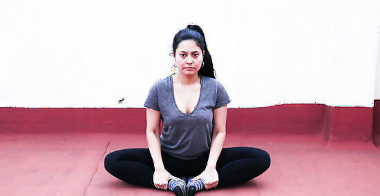 Spread your knees apart and lean forward in between them. To open space for your torso, press your knees out and toward the back of the mat. Keep your spine straight and your upper body lifted. Bring your palms together in prayer position and use your elbows to press your knees back and away from each other. Stay in the pose for several breaths. When leaning your torso into your knees, your toes may turn out instead of facing forward. However, try to keep your toes straight and parallel, if possible. You can place a block underneath your hips to rest on while you maintain this pose.