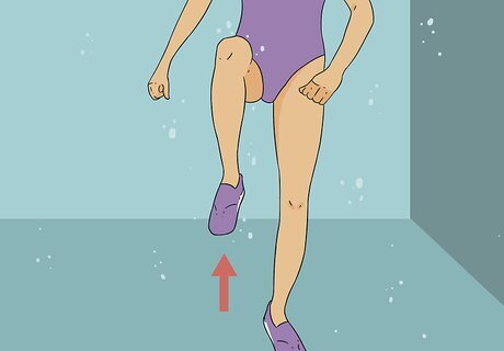 Work your legs. Being in the pool automatically adds resistance to anything you’ll do with your legs. You can walk or jog the length of the pool, do jumping jacks, or kick underwater. To kick underwater, stand with your legs shoulder-width apart in waist deep water. Kick your right leg up as far as is comfortable and then lower it smoothly back down. Then repeat with the other leg. You might want to hold on to the side of the pool to keep your balance while you're walking or jogging. Pushing a pool noodle to the bottom of the pool with your foot or tying the noodle in a loop around your leg can add resistance to leg work as well.