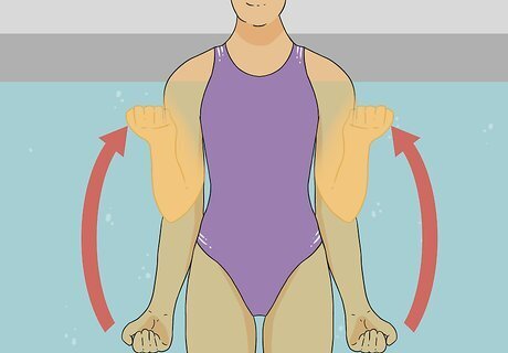 Do underwater bicep curls to work your arms. Stand with your body underwater up to your shoulders. Let your arms rest at your sides with your hands facing up. Then curl your arms up toward your shoulders in an even motion. It should feel like you're trying to scoop water up and out of the pool. To add extra resistance, you can hold a pool noodle or kick board in your hands as you perform the move. The water will push against the noodle or board, making it harder to lift.