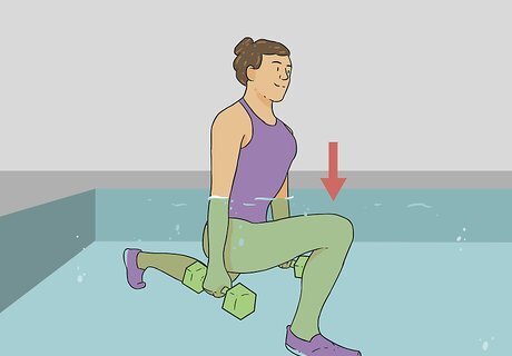 Target your core with lunges. You can work your core in the water by performing underwater lunges. You can hold light weights loosely in your hands when you perform this move to make it a little bit harder. To perform a lunge, stand in waist deep water, with your right foot forward and your thigh parallel to the pool floor. Your left knee should be slightly bent, and your hands should be at your waist. Jump up and switch feet so that your left leg is forward and your right knee is slightly bent.