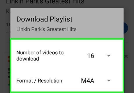 Select a format for the files. Tap the drop-down menu next to “Format / Resolution” to choose the type of files to download. The default is M4A.