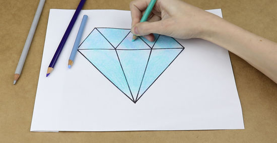 Add shadows and highlights to your diamond. Shadows and highlights will make it look like light is reflecting off of your diamond. Leave the corners of your diamond white and shade in the rest with darker colors like blue and purple.