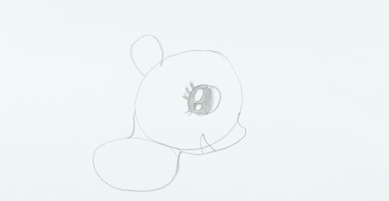 Sketch the mouth and one of the eyes on your pony's head. To draw the mouth, draw a small triangle underneath your pony's snout with a line going through the middle for the tongue. To make the eye, draw an oval inside of a bigger oval. Then, draw a couple eyelashes coming off of the bigger oval. You only need to draw one of your pony's eyes since the other one is hidden on the other side of its head.