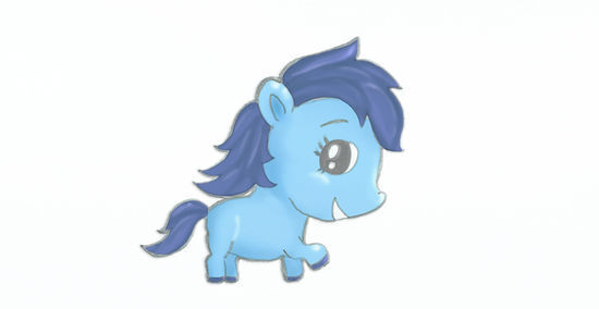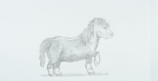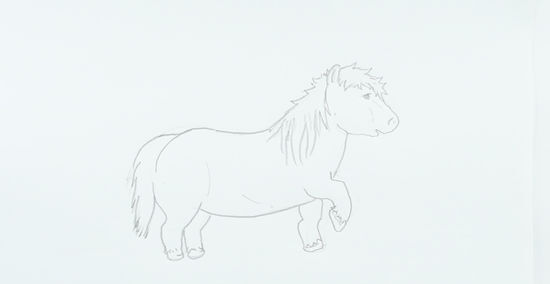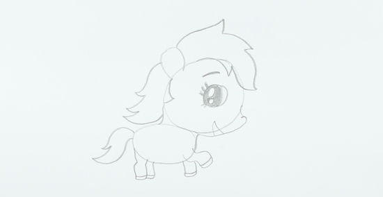 Add in the details to your drawing and erase any unnecessary lines. Go back in and draw your pony's ears, eye, mouth, and nose. Also, draw a mane on your pony's back and a tail coming off of the back end of its body. You can also draw straight lines across the ends of its feet to make the hooves. Don't forget to erase the circles you drew earlier when you were outlining your drawing.
