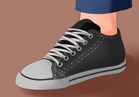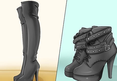 Get Converse shoes or Vans shoes. Footwear is almost exclusively in the style of sneakers in pop punk, especially sneakers made by Converse or Vans. Go for the low top look and pair your Converse sneakers with skinny jeans and a band t-shirt. Or wear high tops with a jean skirt or long shorts and a button up shirt. You can also wear combat boots in black or brown to vary up your footwear.