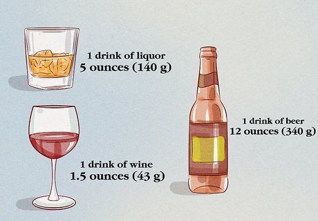 Measure your drinks when you pour them at home. A free-pour of wine or liquor could actually be a much bigger drink than the standard serving. 1 drink of wine consists of 5 ounces (140 g), 1 drink of beer is 12 ounces (340 g), and 1 drink of liquor on its own or in a cocktail is 1.5 ounces (43 g). If you drink at home, start measuring to see exactly how much alcohol you’re drinking every day. Pay attention to the alcohol concentration, too. A higher-percentage drink will affect you more strongly than a lower-percentage one will.
