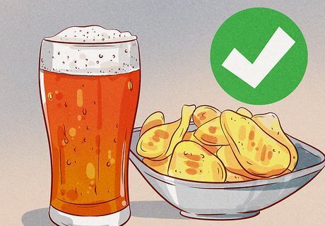 Make it a point to eat something before or while you’re drinking. In general, drinking on an empty stomach is never a good idea. If you’re going out to drink (or even drinking at home), make sure to eat something. If you don’t eat before your first drink, take a break to have some food before having a second one. When you have food in your stomach, the alcohol won’t affect you as quickly, making it less likely that you’ll over-imbibe.