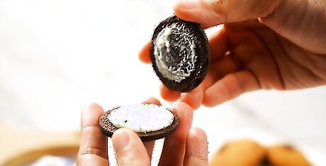 Peel apart sandwich cookies. Cookie sandwiches, such as Oreos, have two layers of cookie separated by icing or jam. To peel these layers apart to get at the icing in between, grab each layer of the cookie with a different hand. Place your fingertips around the circumference of each cookie layer. Gently twist as you pull the layers away from each other. Eat or dunk the top layer of cookie (the one that doesn’t have any icing). You can lick off the icing from the other layer, or eat or dunk it normally.