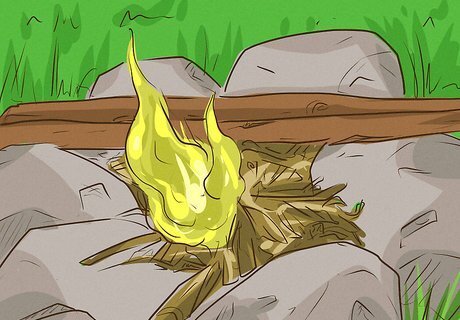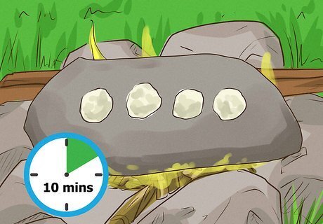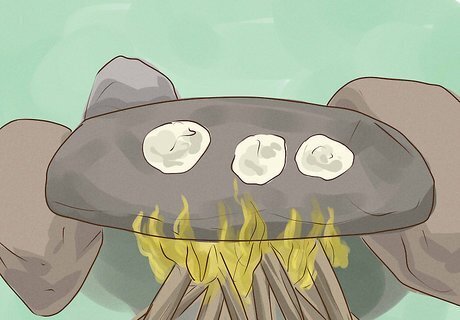 Prepare the fire. Make an open fire. Once you have a good bed of coals, place a flat rock or a slate tile ontop of them. Put some lard or oil on top of the cooking rock or tile.