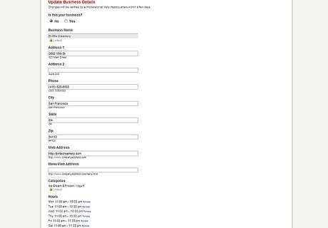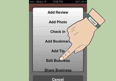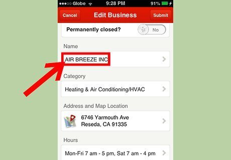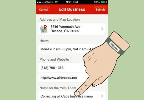 Make as many corrections to the business listing that it entails you to make, editing as much information as you can gather that is initially incorrect, that you have verifiable information for. Tap into each box and adjust the data. Make sure to correct any listing where all the letters in the business title are in "ALL CAPS". If the placemark for the business chosen is also incorrect, follow the directions in Edit the Locations Placemark from the Yelp for iPhone App.