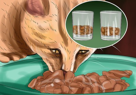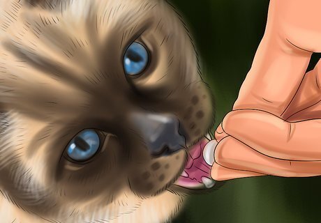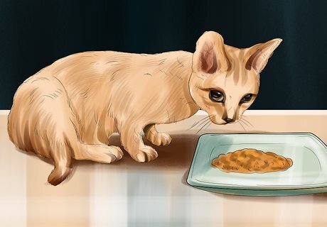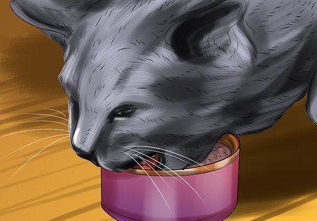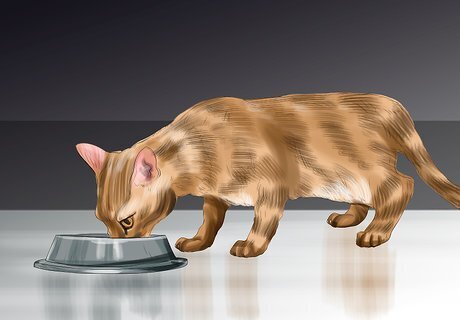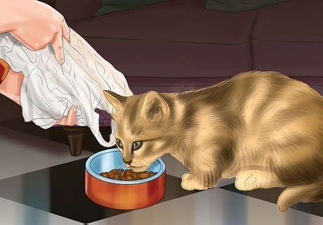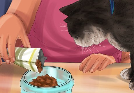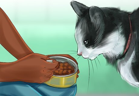 Hand feed the cat. A cat who hasn't been interested in food may be more inclined to eat if you hand feed it. For canned food, you can put a little on your finger and offer it to the cat. For dry food, place a bit in your hand, and hold it out for the cat to eat.