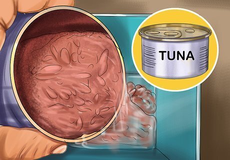 Add a little tuna water on top. If your cat isn't wanting to eat, increasing the good smells of the food may help. Pour a little water from a can of tuna packed in water (not oil) on top of the food. Most cats will be more than happy to eat anything doused in tuna water. You can also try clam juice or even Parmesan cheese.