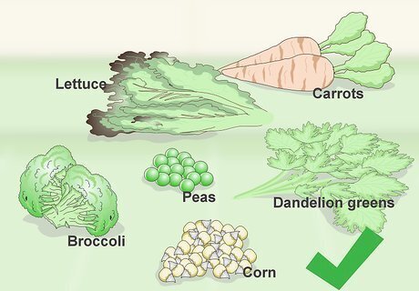Offer fresh veggies. Although bird pellets will provide an excellent base for your bird’s diet, they will not provide all of the phytonutrients your bird needs. Offer a serving of fresh veggies each day (usually in the morning). Use organic produce whenever possible. Remove any uneaten produce after 24 hours. Some veggie options include: Peas Dandelion greens Corn Beet greens Carrots Broccoli Lettuce Spinach Sweet potatoes