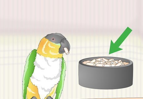 Provide high-quality organic pellets. The base of your caique’s diet should be specially formulated bird pellets. Look for a product made specifically for parrots, or use a cockatiel blend. Try to find pellets that don't have artificial flavorings, colorings, or preservatives in them. Follow the instructions on the product you choose, and provide one serving of pellets to your bird each day, generally in the morning. Uneaten pellets do not need to be removed from the cage, but if your parrot is consistently leaving leftovers you may scale back serving sizes. Bird seed is another option; however, pellets provide a more complete dietary base. If you would rather use bird seed as a base, be sure to provide lots of fruit, veggies, and calcium supplements. Consult your vet to outline a specific seed-based diet.