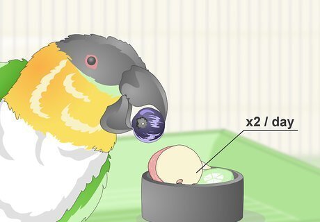 Feed your parrot twice a day. In the wild, parrots will search for their first meal at daybreak, and their second meal in the late afternoon. To work with your parrot's natural rhythm, follow a two-meal-per-day pattern. Offer your parrot food in the morning, and again in the late afternoon. Choose the best feeding times that work for your schedule, and then try to be consistent.