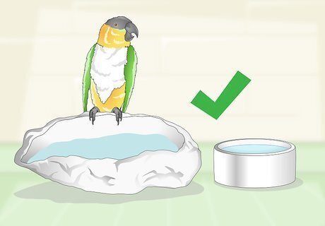 Provide fresh water. Your parrot will need to drink fresh water daily. You can offer water in a small dish, or use a fountain-style water dispenser. Refill the container each day. Caique parrots enjoy bathing in water. It is a good idea to provide a large (large enough for your bird to climb in, but shallow) water dish for bathing. Provide another small dish (too small for your bird to climb in) for drinking.