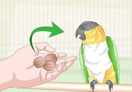 Give your caique walnuts as a treat. Caique parrots are very fond of walnuts. Although these high-fat nuts should not be given on a daily basis, they are an excellent option for an occasional treat. Walnuts can be used very effectively as a treat during training.