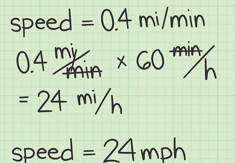 Convert the units as necessary. Sometimes, the final calculation may not be in the units that are most useful to you. If you need or wish to report the speed in different units, you will need to multiply by some conversion factor. For example, a race car's speed is generally measured in miles per hour, not miles per second. Because one hour is equal to 3600 seconds, you can convert the calculated speed by multiplying by 3600 seconds per hour. 0.0556 miles per second ∗ 3600 seconds per hour = 200.16 miles per hour {\displaystyle 0.0556{\text{ miles per second}}*3600{\text{ seconds per hour}}=200.16{\text{ miles per hour}}} 0.0556{\text{ miles per second}}*3600{\text{ seconds per hour}}=200.16{\text{ miles per hour}}.