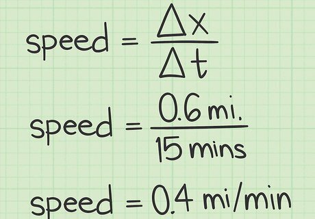 Calculate the average speed. After you have taken the measurements that you need, you then simply place them into the formula for speed calculation to find the speed of the object. Pay attention to the units that you use for the calculation. For the walking trip to school, the distance was measured at 0.6 miles, and the time was fifteen minutes. Place this information in the formula as follows: speed = Δ x Δ t = 0.6 15 = 0.4 {\displaystyle {\text{speed}}={\frac {\Delta x}{\Delta t}}={\frac {0.6}{15}}=0.4} {\text{speed}}={\frac {\Delta x}{\Delta t}}={\frac {0.6}{15}}=0.4 miles/minute. The Indy race car traveled 2.5 miles in 45 seconds. This data goes into the formula for speed calculation as follows: speed = Δ x Δ t = 2.5 45 = 0.0556 {\displaystyle {\text{speed}}={\frac {\Delta x}{\Delta t}}={\frac {2.5}{45}}=0.0556} {\text{speed}}={\frac {\Delta x}{\Delta t}}={\frac {2.5}{45}}=0.0556 miles/second.