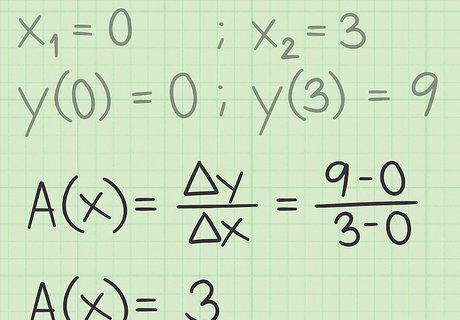 Calculate the average rate of change of the function. The rate of change of a function can be written formally as: A ( x ) = Δ y Δ x = f ( x + h ) − f ( x ) h {\displaystyle A(x)={\frac {\Delta y}{\Delta x}}={\frac {f(x+h)-f(x)}{h}}} A(x)={\frac {\Delta y}{\Delta x}}={\frac {f(x+h)-f(x)}{h}} In this formula, f ( x ) {\displaystyle f(x)} f(x) represents the value of the function at the first chosen x-value. f ( x + h ) {\displaystyle f(x+h)} f(x+h) is the value of the function some distance away at a second value of x. The denominator h {\displaystyle h} h is the distance between the two measurements. h {\displaystyle h} h can also be represented as Δ x {\displaystyle \Delta x} \Delta x, since it is the distance or change in the chosen x-values. For the chosen function y ( x ) = x 2 {\displaystyle y(x)=x^{2}} y(x)=x^{2}, you can calculate the average rate of change from 0 to 3 as follows: A ( x ) = Δ y Δ x = 9 − 0 3 − 0 = 3 {\displaystyle A(x)={\frac {\Delta y}{\Delta x}}={\frac {9-0}{3-0}}=3} A(x)={\frac {\Delta y}{\Delta x}}={\frac {9-0}{3-0}}=3.