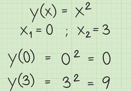 Calculate the values of the function. Rate of change of the function measures how much the y-values change over the chosen horizontal x-distance. To calculate this change, you need to know the y values at each chosen value of x. For the sample function, y ( x ) = x 2 {\displaystyle y(x)=x^{2}} y(x)=x^{2}, select the two values x=0 and x=3, for example. The corresponding values of y ( x ) {\displaystyle y(x)} y(x), therefore, are: y ( 0 ) = 0 2 = 0 {\displaystyle y(0)=0^{2}=0} y(0)=0^{2}=0 y ( 3 ) = 3 2 = 9 {\displaystyle y(3)=3^{2}=9} y(3)=3^{2}=9