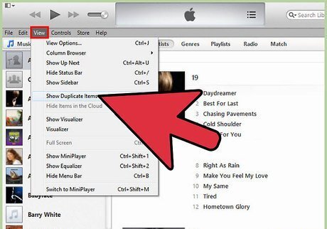 Open the Music library in iTunes. Press the Alt key(Windows 7 & 8),Shift key (Earlier versions of Windows) or the Option key (Mac) and click the View menu. Select “Display Exact Duplicate Items”. This will change your list of songs to all of the duplicate tracks on your computer. These are duplicates that share the same song name, artist, and album. If you don't hold the Shift or Option key, you will get the standard “Display Duplicates” option. This will show duplicates based on song name, but doesn't differentiate between albums. This means that re-recordings and liver versions often show up as duplicates even though they aren't. Make sure you are using the [Update-iTunes|latest version of iTunes]]. Older versions of iTunes may have the “Display Exact Duplicates” option in the File menu instead of the View menu.