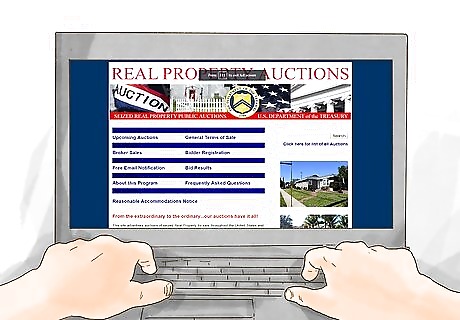 Check eBay. Real estate is sometimes put up for sale on eBay, which is an online auction site. You can search listings for free, but you will need to create an account if you want to bid. Many of the listings are only classified ads, not actual auction listings. Review the listing carefully.