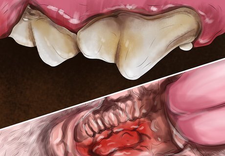 Look in your dog's mouth. Pain can cause an older dog to become aggressive, due to irritability from the pain. Dental disease can be very painful and is a common underlying health problem related to aggression in older dogs. If your dog will allow you, look in its mouth for signs of dental disease: Bad breath Gingivitis (red, irritated gums) Bleeding from the mouth Loose, cracked, or missing teeth Plaque buildup on the teeth