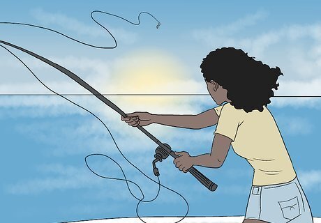 Cast the eel out. When casting your eel out, go easily at first until you find the sweet spot -- you don't want to rip out the hook. Give the eel a few seconds to reach the bottom—depending on the strength of the current and depth of the water—before you start to slowly reel it in. You may need to add up to 1/2 ounce of weight in the form of a rubber core sinker if the tide and wind is particularly strong. Start reeling at a very slow rate of 3 to 5 seconds per revolution—you want the eel to do most of the work for you.