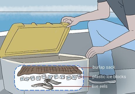Make sure to store the eels under the right conditions. Place the eels in a cooler with a plastic ice block and a damp burlap sack. This keeps the eels moist and cool. The ice also has the advantage of slowing down the eel's metabolism, which makes them easier to handle. Don't submerge the eels in water, as they will deplete the oxygen levels and eventually drown.