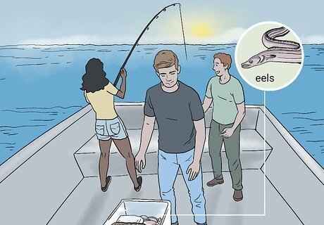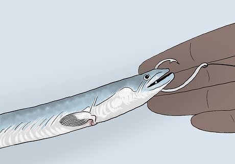 Hook the eels. Eels are slithering, squirming creatures, so they can be difficult to handle and hook. Use a burlap sack or even a cotton sock to hold the eel, as this will give you a better grip. Hold the eel around its neck in order to hook it. Use circle hooks to avoid gut hooking bass. Hook the eel in one of two ways—either pass the hook through the top of the eel's mouth and out one of its eyes, or place the hook as deeply into the eel's mouth as possible and pass it through the bottom of its throat. The former method hooks the eel more securely but runs the risk of accidentally killing it, while the latter method is less secure but keeps the eel alive for longer and makes the hook appear less obvious.