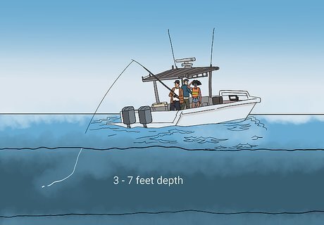 Keep the bait at the right level. Tube and worm trolling works best in water 3 to 7 feet (0.9 to 2.1 m) in depth, though it's possible to fish as deep as 20 feet (6.1 m). Let the line out slowly, keeping it taut, until you feel the rig bouncing off the bottom. Reel the line in one or two turns, to keep the rig just above the bottom. The amount of colors of lead core trolled behind the boat can help you to determine the depth at which the tube and worm is being trolled. For example, if bass are holding at 15 feet (4.6 m), then 3 colors (5 feet (1.5 m)/color) is used to reach the bass. Try to slowly weave the tube forward and back on opposite 45 degree angles—this helps the movement of the bait to appear more natural.