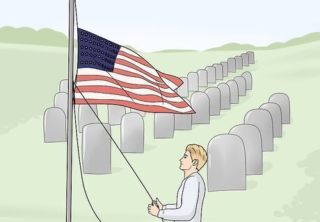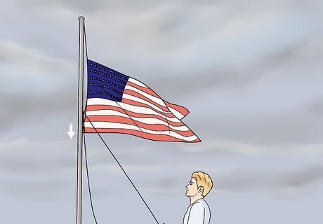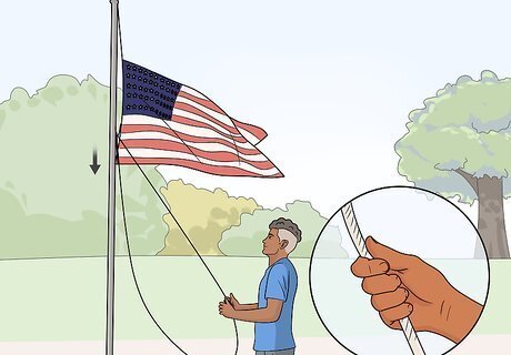 Lower the flag ceremoniously and never let it touch the ground. When it comes time to take the flag down, lower in the opposite way that you raised it. Pull the rope smoothly and slowly so the flag lowers in a ceremonious way. Stop pulling when you can reach the flag to detach it from the rope. Never let it touch the ground during this process. Civilians should stand at attention and face the flag as it's being lowered. Military service members should salute the flag.