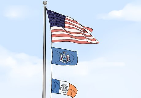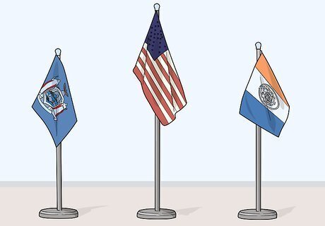 Arrange other flag poles so the American flag is in the center and at the highest point. If you’re displaying multiple flags on different poles, place them on the sides of the American flag. Use poles that are shorter than the one holding the American flag. There is no requirement for how much shorter they should be. This is a common arrangement for poles on a stage. If the poles are all the same height, then display them on the right of the American flag from the audience’s perspective. For example, from left to right, the order should be American flag, New York State flag, New York City flag. If you're on US soil, other nation's flags should be the same height as the American flag and to its right.