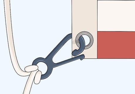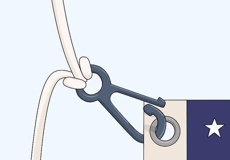Attach a hook or fastener to the pole's rope at your eye level. There are special hooks that clip the flag to the pole rope and keep it secure. Take a bit of rope at your eye level and pinch a loop between your fingers. Insert that bit of rope through the hole on the bottom of the hook and loop it over the top. Pull the rope back so it tightens around the hook. Some clips may use different instructions, so confirm the procedure on the product you use. Starting at the eye-level is important so the flag doesn’t touch the ground while you’re hanging it. This is a violation of the flag code. If the flag is large, work with a second person to hold the flag so it doesn't touch the ground. You can buy flagpole clips from hardware stores or on the internet.