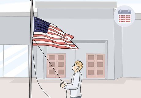 Put out the flag on state and national holidays. There are no rules for which days to fly the flag, and you can fly it every day if you want. However, whether you fly the flag daily or only occasionally, there are national and patriotic holidays that you should display the flag on. Keep track of these holidays and display your flag to show your patriotism. Traditional holidays to display the flag are Memorial Day, Veterans’ Day, July 4th, and Flag Day. If your state or city has particular patriotic holidays, you can also display the flag on these days. Some calendars list days that you should fly the flag on. You can also hang the flag on significant historical events, like the Allied invasion of Normandy on June 6 and the end of the Civil War on May 9.