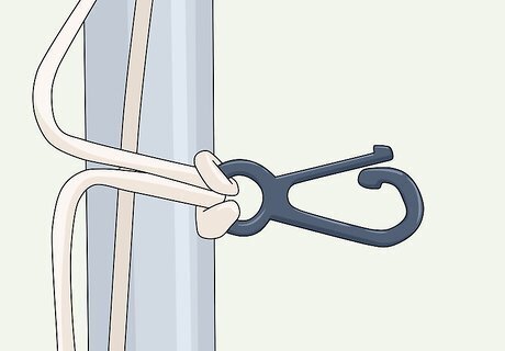 Attach another hook near the bottom of the flag. Use the same process to loop the rope through the hook. Then attach the hook to the bottom hole on the flag. You might have to raise the flag a bit to prevent it from touching the ground during this step. Larger flags may also have a third hole in the middle. If so, attach a clip and loop it through the flag here as well.