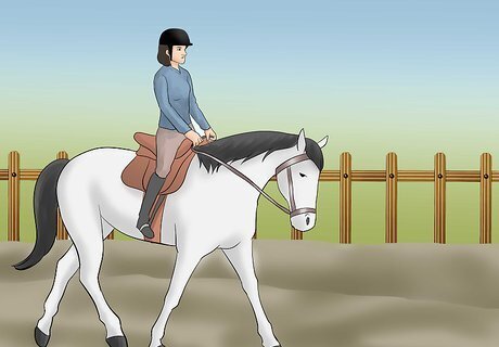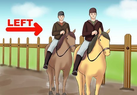Pass other horses on the inside. If you need to pass a horse that’s travelling more slowly than you are, pass the horse on the inside. In other words, do not go between the fence and the other horse. Go to the left of the slower horse, closer to the middle of the ring. Be sure to communicate with the rider you’re passing by saying “On your left” or something similar, so that she knows where you are.