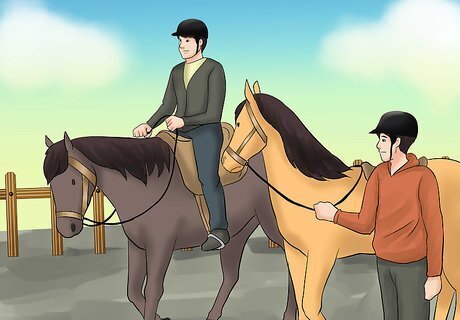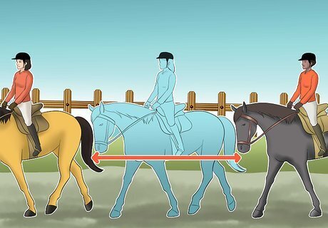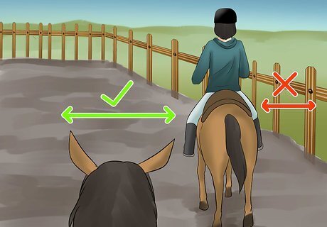 Maintain a safe distance from other horses. You should be at least one horse length (but preferably two) away from any other horse at all times when you’re in the arena. Other horses can become upset if you pass too close to them. Horses can also kick pretty far out to the side and behind them. Keep a safe distance away from other horses while you’re in the arena.
