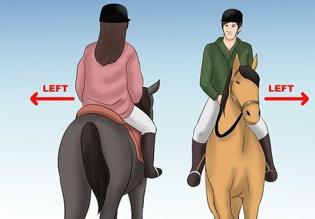 Always pass “left to left.” The “left to left” rule applies when you are travelling around the ring in a different direction than someone else. If you are facing another rider head-on, you should pass such that your left shoulder is closest to their left shoulder. In other words, if you see an oncoming rider, go to your right side of that person. Someone may override this rule in the ring by calling, “Rail!” Be aware of this possibility and always keep an eye on your surroundings.