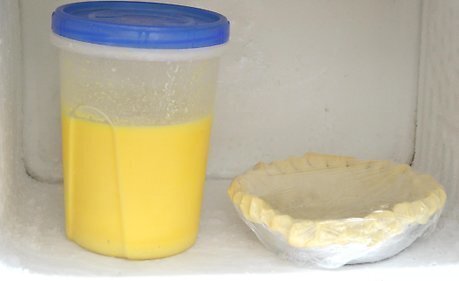 Thaw the custard filling in your refrigerator. If you thaw the custard, cream, or pumpkin filling at room temperature, the filling will become watery and may result in a soggy pie. Give your custard or cream filling about 24 hours to thaw fully in your refrigerator.