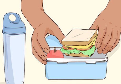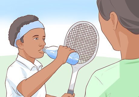 Keep your kids hydrated. Fill a water bottle with cool water so your kids can cool down and quench their thirst as needed. Encourage your child to drink water or an electrolyte-rich beverage with low-to-moderate amounts of sugar every 15 to 20 minutes during physical activity. Remind your child before the game that they should be drinking regularly even if they are not thirsty. Do not provide your child with sugary drinks like soda and sweet juices. These beverages can spike the blood sugar levels, leaving your children with a quick burst of energy, but a steep decline in energy once the spurt wears off.
