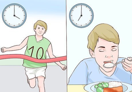 Eat at the right time. After an intense workout or sporting event, your child should get a snack of some carbs and protein within about 20 minutes. For instance, if your child’s game ends at 4:00, they should have some mixture of carbs and protein by 4:20 at the latest. Then, about two hours later, your child should eat a larger, proper meal. In other words, assuming again that your child’s game ended at 4:00, they should be ready to eat a meal around 6:00 or 7:00.